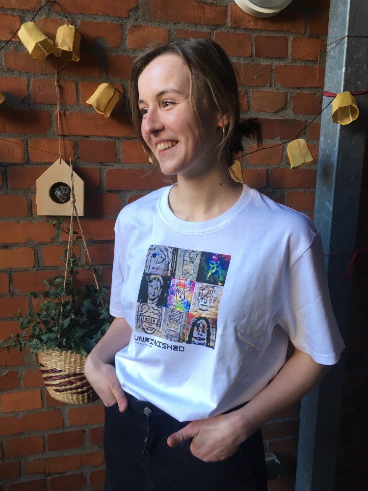 Ich freue mich immer über Post, aber letzte Woche, als ich dieses groß(!)artige T-Shirt aus meinem Briefkasten gezogen habe, habe ich mich ganz besonders gefreut. Auf dem Shirt sind insgesamt neun Portraits, meines und acht anderer Teilnehmer*innen des KI Camps. Die Bilder basieren auf Selbstportraits, die dem Künstler Roman Lipski als Input für sein Künstliches Neuronales Netz UNFINISHED dienten.